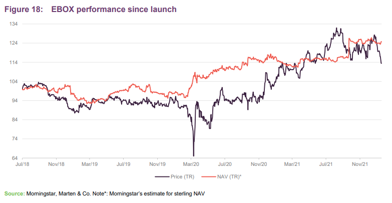EBOX’s NAV made steady progress from launch as it pieced its portfolio together. The NAV grew significantly with the deployment of the proceeds of the equity raise in March 2021, and the manager expects it to grow substantially further with the deployment of the September 2021 proceeds and the private placement as detailed earlier. EBOX’s NAV is quoted in euro, and the NAV in Figure 18 is Morningstar’s estimate for sterling NAV based on the daily exchange rate.