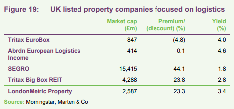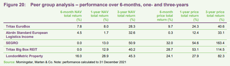 Most property companies investing in European logistics are unlisted funds or subsidiaries of larger groups. The listed peer group we have assembled consists of EBOX’s closest peer abrdn European Logistics Income (ASLI); SEGRO, which owns a mixture of ‘big box’, urban and industrial space, about a third of which is located in continental Europe; Tritax Big Box; and LondonMetric Property. The latter two are UK-focused.