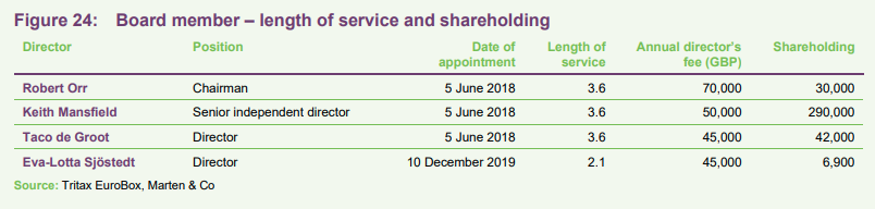 EBOX’s board is comprised of four directors, all of whom are non-executive and considered to be independent of the investment manager. All directors stand for re-election on an annual basis.
