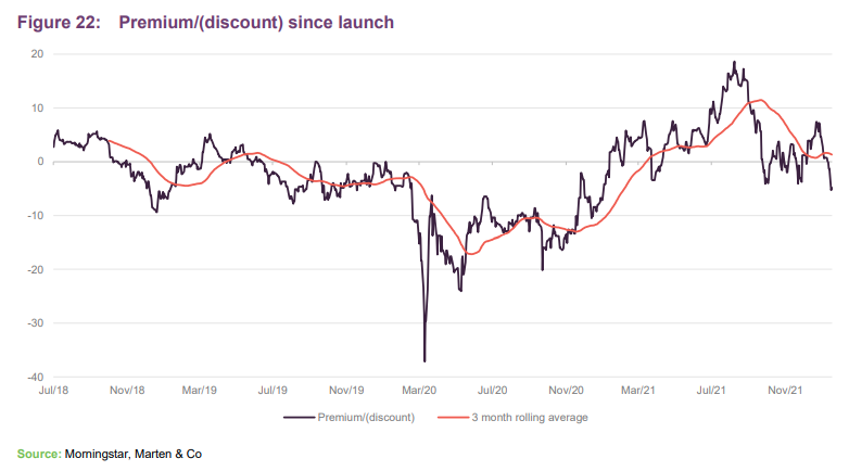 EBOX’s rating had fluctuated between a 5% premium and a 10% discount for the first 18 months from launch, as it grew its portfolio. When the COVID-19 pandemic hit markets in early March 2020, EBOX’s discount widened to as much as 38% before narrowing considerably. Perhaps as the market recognised the structural tailwinds at play in the continental logistics sector, exacerbated by the pandemic, its discount narrowed and moved to a premium rating from early 2021. The recent equity raise and growth in NAV has seen the premium narrow and on 25 January 2022 EBOX was trading at a 4.8% discount.