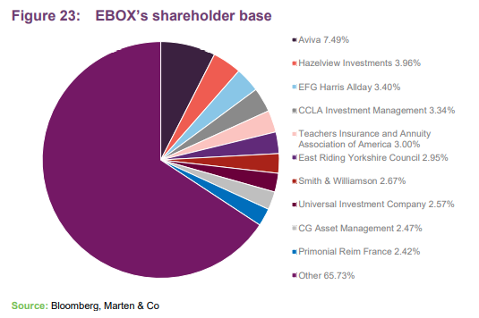 EBOX’s shares are traded on the premium segment of the London Stock Exchange, with both a sterling and euro quotation. These are the same class of shares and trading line, are fully fungible, and have no impact on overall liquidity of the stock. On 1 October 2021, the group was added as a constituent of the FTSE 250 index. To enhance equity returns, the company uses gearing, with a medium-term target of 45% of gross assets and a maximum limit of 50%.