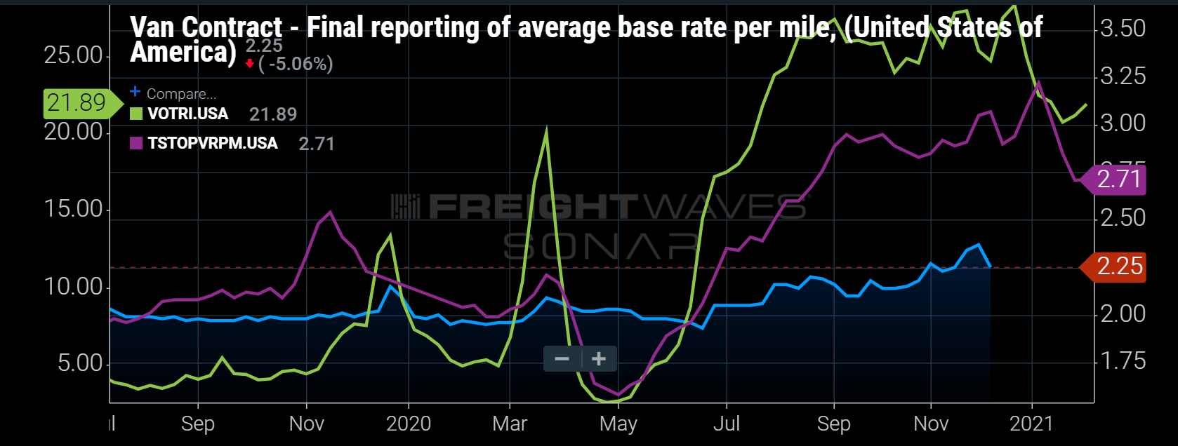 Chart of the Week: Van Contract Base Rate per Mile, Van Outbound Tender Rejection Index, Truckstop.com 7-day rate per mile Van– USA SONAR: VCRPMF.USA, VOTRI.USA, TSTOPVRPM.USA