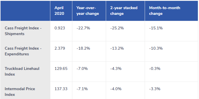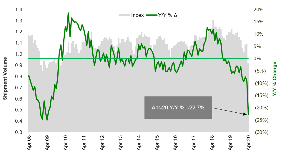 Freight volumes fell to 2009 levels in April, although for much different reasons than a decade ago. Compared to last year, volumes were down 22.7%. We believe the market has hit bottom and May will be better. With demand in negative territory, so is the cost of shipping. Truckload linehaul rates are down 7% from a year ago (although they’ve been essentially flat all year), and the total cost of intermodal shipping is down 7.1%.