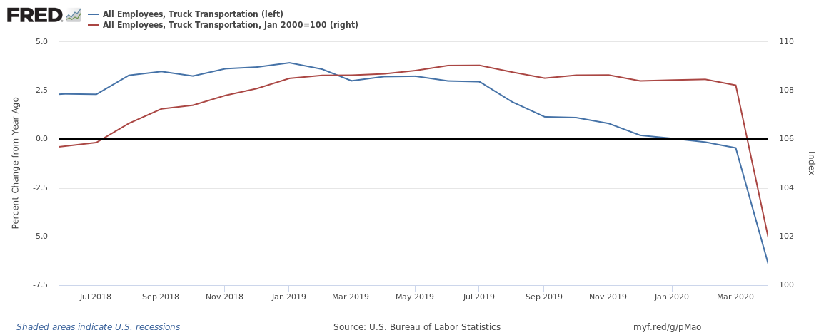 I put a heavier weight on the CASS index year-over-year which is consistent with rail and ocean freight. It is not logical that truck freight goes up when industrial production and ocean freight decline – not to mention the continuing effects of the trade war and the coronavirus shutdown.