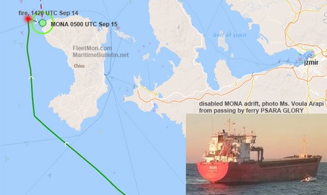 Fire erupted in engine room of general cargo ship MONA at around 1420 UTC Sep 14 in Aegean sea, off Chios island western coast. Fire was extinguished by the crew, no injures reported, but the ship couldn’t continue her voyage from Ashdod to Tuzla, and had to be anchored in front of Agio Gala village, Chios. Was in the same position as of 0510 UTC Sep 15, extent of damages and her present condition unknown. She might continue voyage under own power, or require towage.