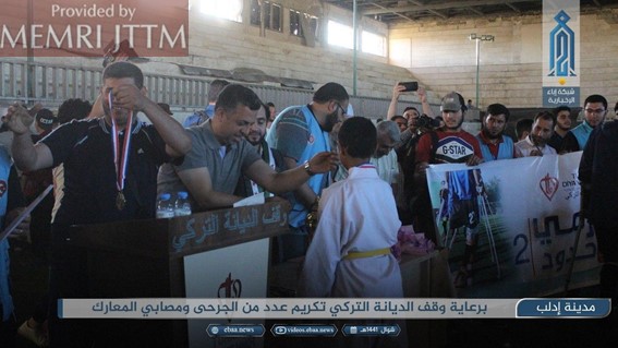Turkish news reports have indicated connections between the Diyanet and the activity of jihadi groups such as ISIS and Hay’at Tahrir Al-Sham (HTS), and Turkish politicians have made formal inquiries about these connections.[39] On May 30, 2020, an event honoring fighters wounded fighting the Syrian regime and its allies was held in the city of Idlib, Syria, which is controlled by HTS and by Turkish forces there. The event, titled “My Steadfastness Has No Limits” and featuring the distribution of monetary grants to disabled fighters, was organized by the Türkiye Diyanet Vakfı (“The Diyanet Foundation Of Turkey,” TDV). The event was extensively covered by the pro-opposition media, including the HTS news agency.[40] TDV was founded in 1975 for the purpose of supporting the Diyanet.[41] In August 2019, President Erdoğan signalled his support for the TDV by donating a sacrificial animal to it.[42]