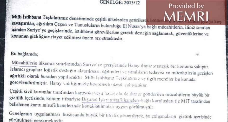 A memorandum reportedly from the interior minister instructing the governor of Hatay to allow jihadi fighters to use Diyanet guestshouses under the surveillance of Turkish intelligence.