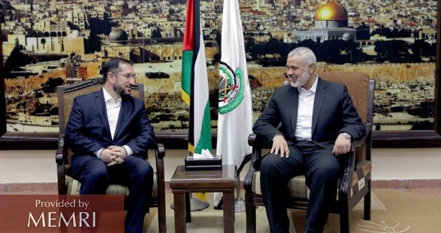 TDV director Mustafa Tutkun, left, meeting with Hamas Political Bureau Chairman İsmail Haniyeh in 2016 (source: Kudusbulteni.com).