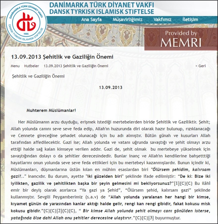 A portion of the sermon about jihad and martyrdom on the Turkish Diyanet Foundation Of Denmark website.