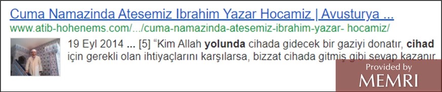 The website of Austria’s Avusturya Türk İslam Kültür ve Sosyal Yardımlaşma Birliği (“Turkish Islam Culture And Social Cooperation Union Of Austria,” ATIKSYB) lists a Friday sermon published September 19, 2014. The title of the page reads: “Our teacher, attache Ibrahim Yazar, in Friday Prayer.” The sermon cites a hadith that reads: “Whoever equips a veteran who will go on jihad in the path of Allah, or meets his needs for jihad, will earn a reward as if he himself had gone on jihad.” A username with the website is required to view the full sermon.[59] The Diyanet lists the ATIKSYB in its Aile magazine as one of its foundations abroad.[60]