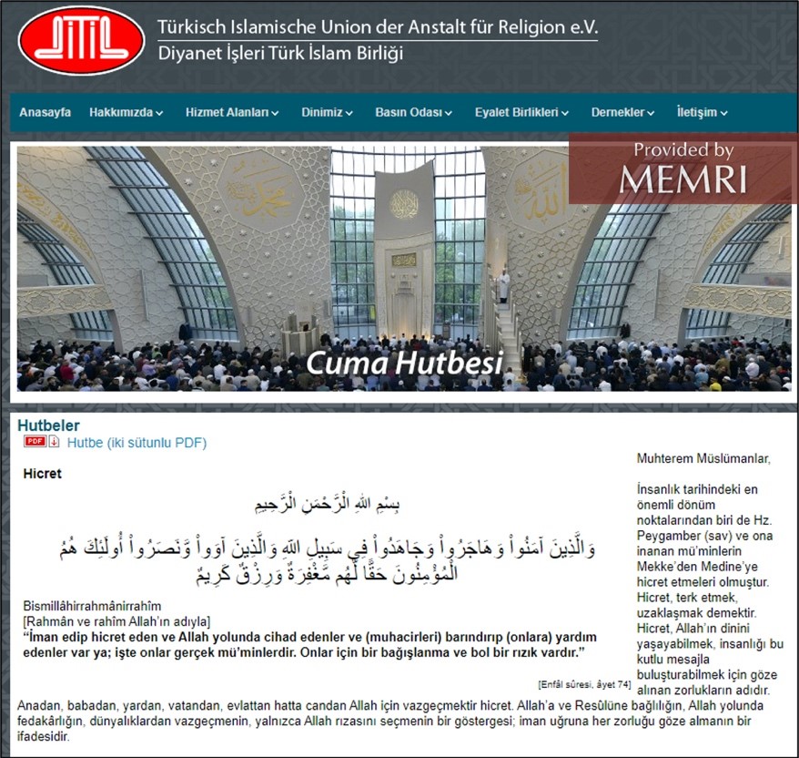 A transcript of a sermon listed on the website of Germany’s Diyanet İşleri Türk İslâm Birliği (“Turkish Islam Union For Religious Affairs,” DITIB) dated November 1, 2013, titled “Hijra [migration]” reads: “Hijra means abandoning, going far away. Hijra is the name of the difficulties considered in order to live Allah’s religion and unite humanity with this blessed message. Hijra is giving up, for Allah’s sake, on the mother, the father, friend, homeland, children, and even life…” The sermon quotes Quran 8:74: “But those who have believed and emigrated and made jihad in the cause of Allah and those who gave shelter (to the muhajireen) and aided (them) – it is they who are the believers, truly. For them is forgiveness and abundant provision.”[61] The sermon gives a name Huriye Akbıyık, who is described as “religious functionary at the Central Mosque of Munich.” A similar sermon was given on November 16, 2012, with the name Dr. Ersan Özten, who is described as “religious functionary at the Central Eyüp Sultan Mosque of Nuremburg.”[62]