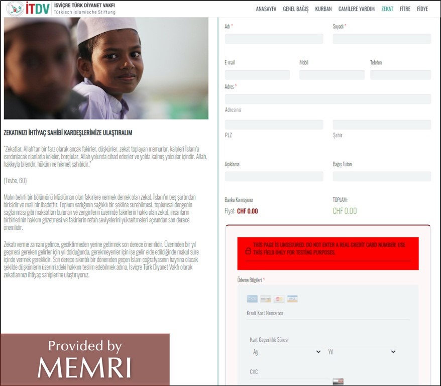 TDV websites by which Muslims can donate zakat (“alms”) quote Quran 9:60: “Zakat expenditures are only for the poor and for the needy and for those employed to collect zakat and for bringing hearts together [for Islam] and for slaves, debtors, for those who make jihad in the cause of Allah and for the traveler stuck on the path – an obligation from Allah. Allah is the one who knows with truth, and is the master of ruling and wisdom.”[63] The website of Switzerland’s İsviçre Türk Diyanet Vakfı (“Turkish Diyanet Foundation Of Switzerland,” ITDV) quotes the same verse, as does a PDF that that website released.[64] A sermon published on July 25, 2014, on the website of Germany’s DITIB quotes it as well. That sermon gives the name Abdurrahman Latifoğlu, who is described as the “religious functionary of the Great Mosque of Kiel.”[65]