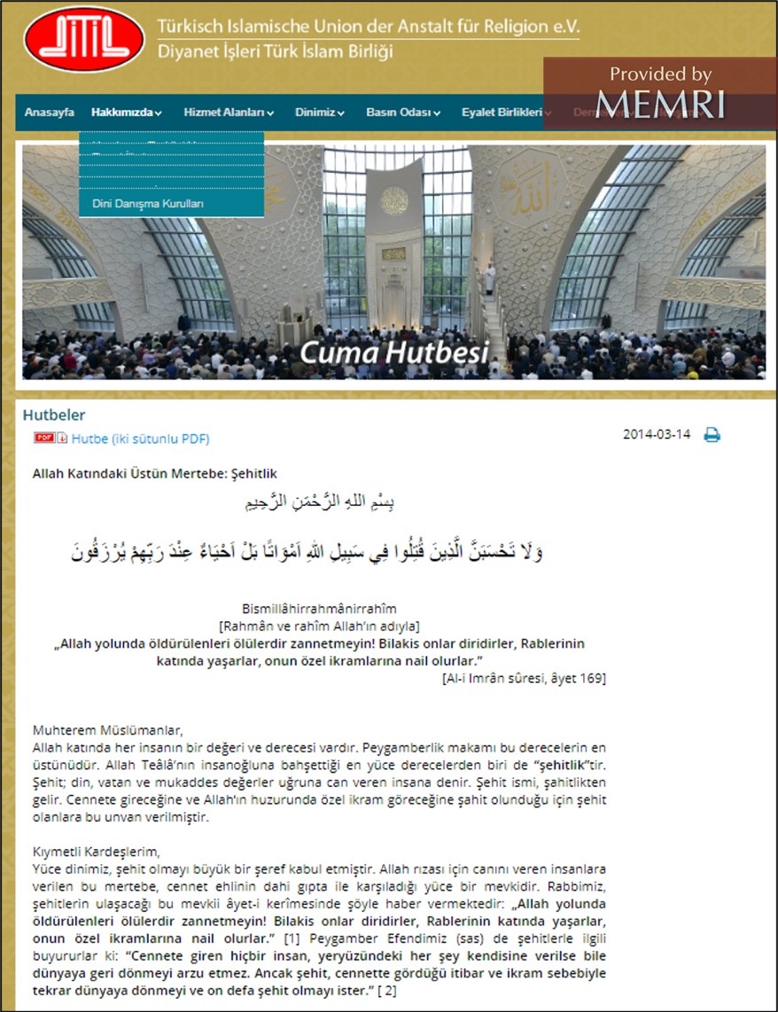 A transcript of a sermon listed on website of Denmark’s DTDV dated November 1, 2013, titled “Hijra” is similar and also quotes Quran 8:74, as did the sermon by the German DITIB.[66] A transcript of a sermon listed on the website of Germany’s DITIB dated March 14, 2014, titled “The Superior Rank In The Eyes Of Allah: Martyrdom” reads: “One of the highest ranks that Allah almighty bestowed on humanity is ‘martyrdom.’ A martyr is what you call a person who gives his life for his religion, homeland, and holy values. The name martyr comes from martyrdom. Since they will go to paradise and see special treatment in the presence of Allah because of this martyrdom, this title was given to the martyrs… Our supreme religion recognizes being a martyr as a great honor.” The sermon then quotes Quran verses about martyrdom. It gives the name Idris Ertürk, who is described as the “religious functionary for the Osman Gazi Mosque of Berlin.”[67]