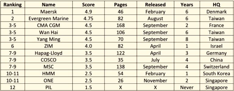 Gliese Foundation has published twelve independent reviews of the largest container carriers. The table presents the ranking, name, score, number of pages of the Sustainability Report (still called CSR Report by some companies), the month of release of the report, number of years producing sustainability reports (the number available on the website, including 2019), and country in which each company is headquartered. Below are some highlights of each of the reviews.