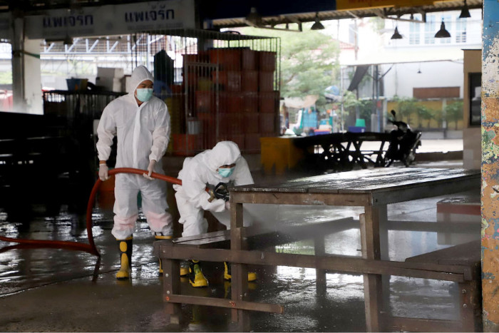 Workers spray disinfectant at the shrimp market in Samut Sakhon on Friday, as authorities try to contain the spread of coronavirus first detected in a shrimp vendor. (Photo from Samut Sakhon Public Relations Office Facebook page)