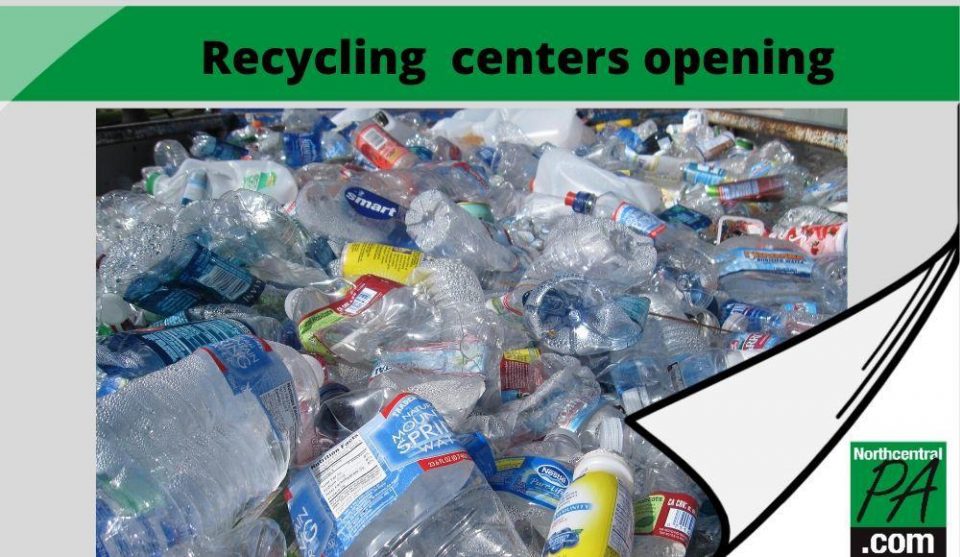 Recycling drop off sites have reopened at Montoursville Borough (located behind the Borough Office Building in Indian park) and Old Lycoming Township (located at 1240 Princeton Avenue, Williamsport).