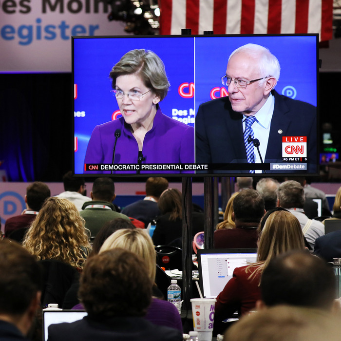 If you didn’t watch last night’s Democratic presidential candidate debate from Des Moines and just checked into your favorite media outlets this morning to see what happened, you might have seen two distinctive takes that might as well have described two different events. One (offered by such veteran observers as Vox’s Matt Yglesias, TNR’s Walter Shapiro, and Politico’s Ryan Lizza) tended to treat the debate as unremarkable, with the candidates performing at various levels but not really generating any big moments, in part out of fear of offending Iowans’ famous sensitivity to negative politics. The other (including one I posted last night) focused heavily on the unsettling confrontations of Elizabeth Warren and Bernie Sanders after CNN moderator Abby Phillip, citing CNN reporting, injected an alleged statement by Sanders to Warren that a woman cannot beat Trump, into an otherwise mild-mannered debate. The dispute culminated in Warren refusing to shake Sanders’s hand after the event and Sanders seeming to storm away in frustration after a brief exchange of words.