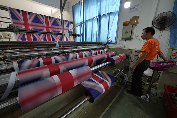 A worker produces British flags at the Shaoxing Chuangdong Tour Articles Co. factory in Shaoxing, in eastern China’s Zhejiang province, Friday, Sept. 16, 2022. Ninety minutes after Queen Elizabeth II died, orders for thousands of British flags started to flood into the factory south of Shanghai. (AP Photo/Ng Han Guan)