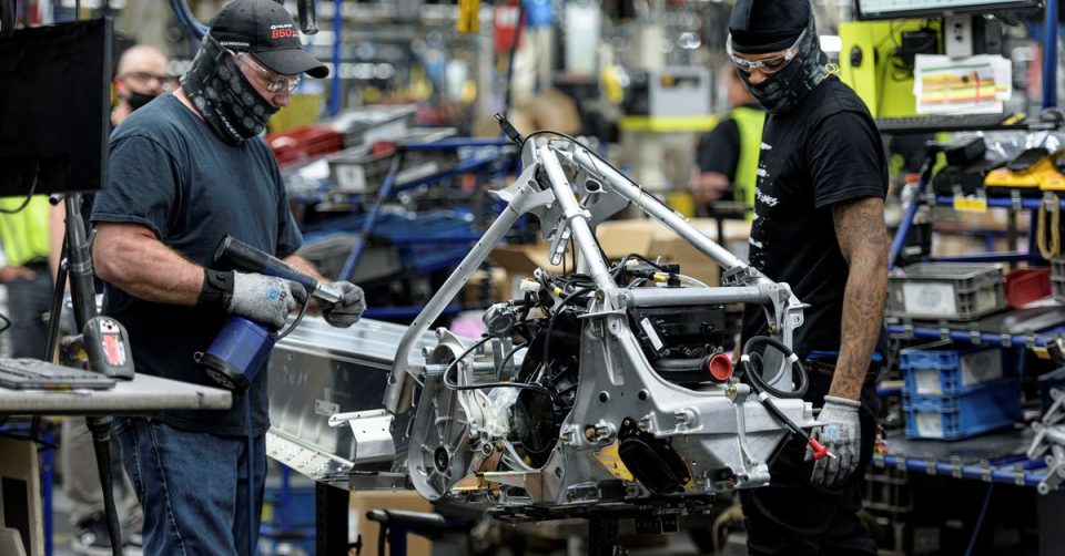People work on a Polaris snowmobile assembly line at their manufacturing and assembly plant in Roseau, Minnesota, U.S. June 7, 2021. REUTERS/Dan Koeck