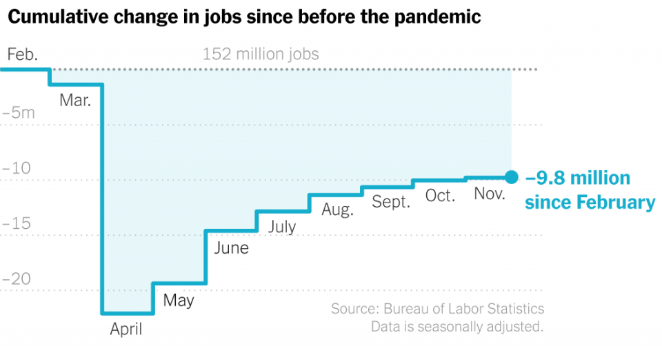 Speaking in Delaware, Mr. Biden thanked the Republican and Democratic senators who are attempting to negotiate a $908 billion compromise package during the lame-duck session, saying, “This situation is urgent. If we don’t act now, the future will be very bleak.” His statement followed the bleak jobs report for November, which showed U.S. hiring tapering off.