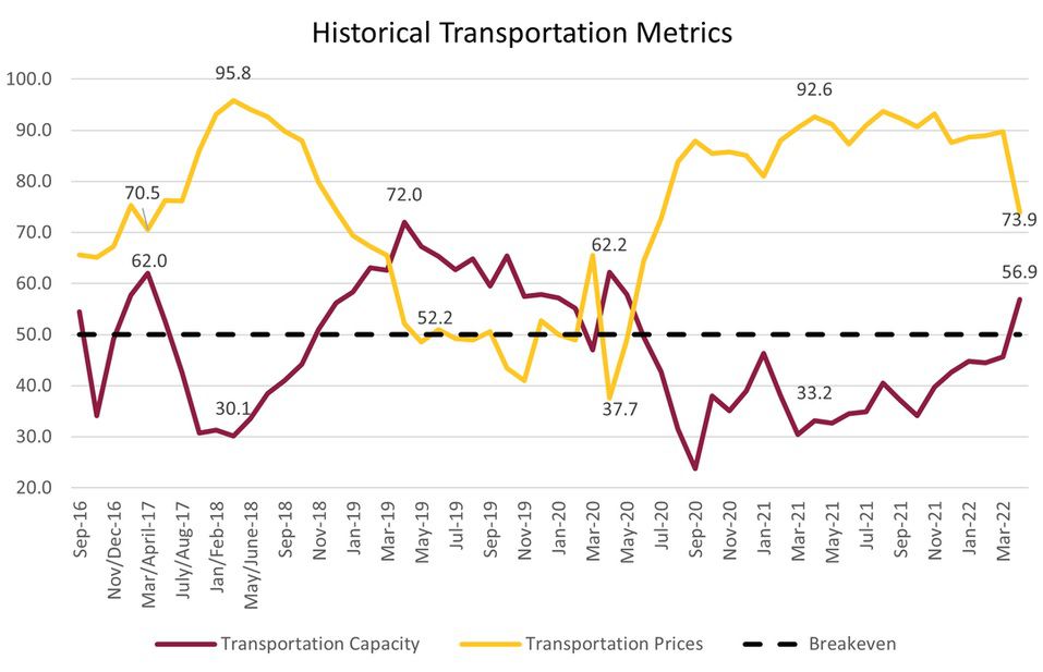 “We have often stated that transportation metrics are the most dynamic piece of the LMI and the most reflective of the overall economy,” the report stated. It noted that any inversion in capacity and price trendlines normally occurs when there has been a shift in the broader economy. “It can be observed that the two curves have not yet inverted, suggesting that while the frantic pace in the transportation market has slowed down, we have not yet tilted into a full-on recession.”