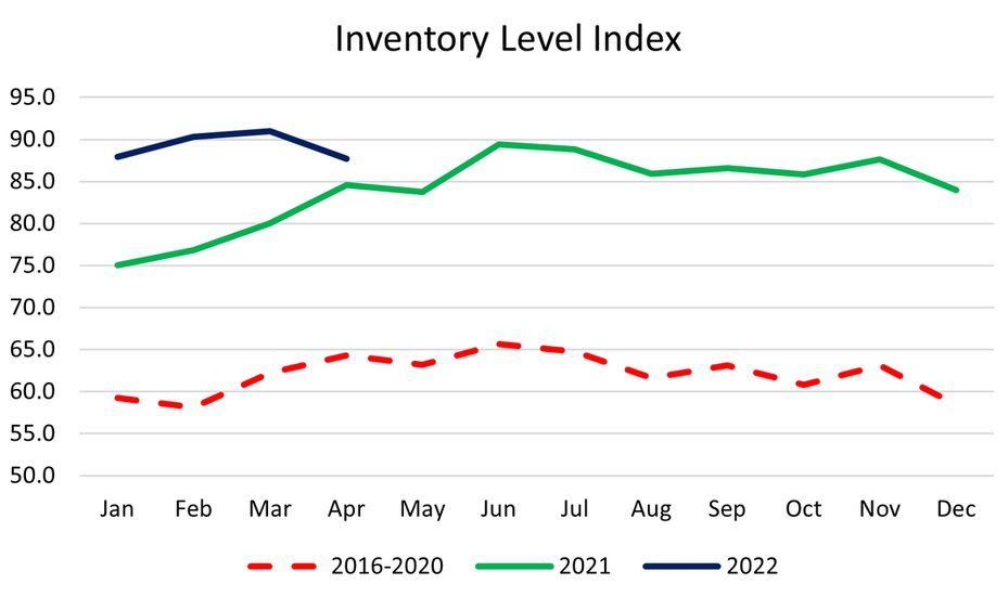 Inventory levels (72.3) and inventory costs (87.7) continued to grow but the growth rates were off recent highs, with both indexes down 3.3 percentage points in the month.
