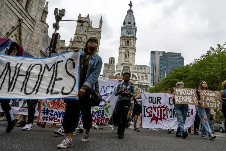 After leaving City Hall, the group marched to the Pennsylvania Academy of Fine Arts, where they said developers were holding a gathering. They carried their signs into the building’s lobby.