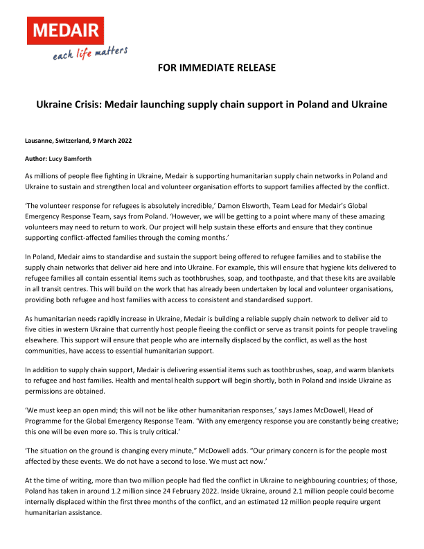 As millions of people flee fighting in Ukraine, Medair is supporting humanitarian supply chain networks in Poland and Ukraine to sustain and strengthen local and volunteer organisation efforts to support families affected by the conflict.