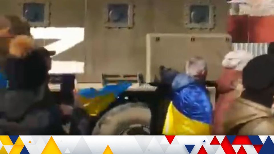 Pictures taken over several days from the city show protesters carrying the Ukrainian flag filing past Russian vehicles emblazoned with the letter Z – and Russian soldiers aiming their weapons at civilians.