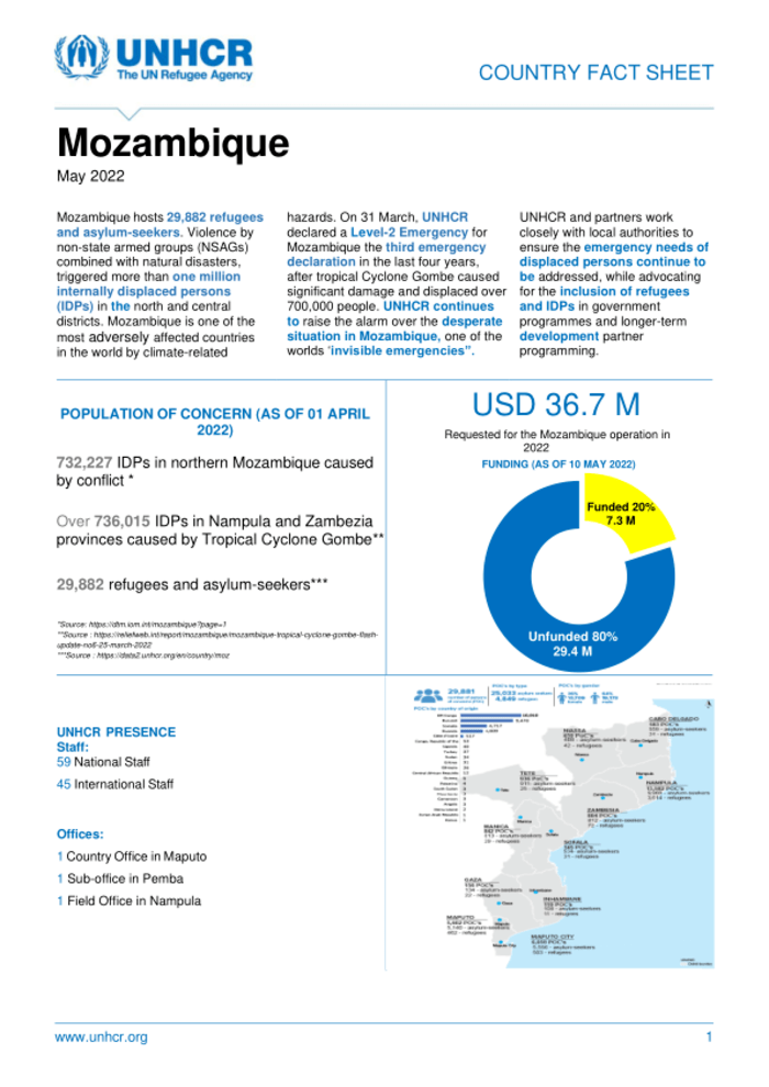 Mozambique hosts 29,882 refugees and asylum-seekers. Violence by non-state armed groups (NSAGs) combined with natural disasters, triggered more than one million internally displaced persons (IDPs) in the north and central districts. Mozambique is one of the most adversely affected countries in the world by climate-related hazards. On 31 March, UNHCR declared a Level-2 Emergency for Mozambique the third emergency declaration in the last four years, after tropical Cyclone Gombe caused significant damage and displaced over 700,000 people. UNHCR continues to raise the alarm over the desperate situation in Mozambique, one of the worlds ‘invisible emergencies”.