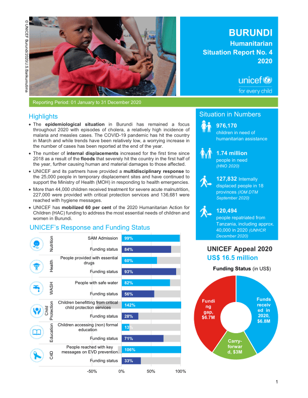 UNICEF has mobilized 60 per cent of the 2020 Humanitarian Action for Children (HAC) funding to address the most essential needs of children and women in Burundi.