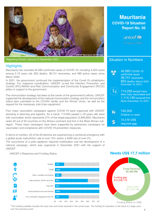 Four mass vaccination campaigns against COVID-19 were organized with UNICEF assisting in planning and logistics. As a result, 714,954 people (>18 years old) were fully vaccinated, which represents 27% of the target population (2,690,855). Mauritania ranks 22 out of 52 countries on the African continent and first in the West African subregion. These mass campaigns have been supported by awareness campaigns for vaccination and compliance with COVID-19 prevention measures.