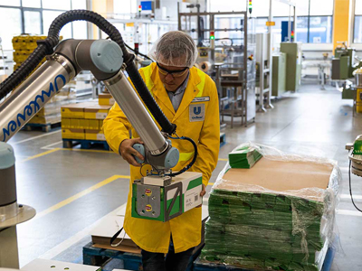 “Six UR10 cobots pack and place ready-to-sell cartons on pallets. In the past, employees spent 70 per cent of their time packaging and 30 per cent palletising, but thanks to the cobots, 30 per cent of their time was freed up to focus on valuable and strategic tasks,” he said.
