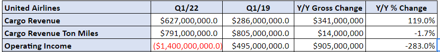 Sales for United Cargo improved 119% from pre-pandemic levels and were 26% better than a year ago even though cargo revenue ton miles — tons multiplied by distance traveled — were 1.7% lower than in 2019 at 791 million.