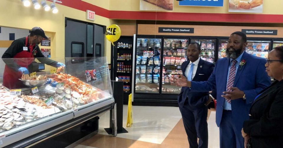 Shoppers Store Director, Rahman Glassgow (center), highlights the fresh seafood department for Maryland State Delegate Jazz Lewis (left) during the grand opening celebration at Shoppers’ Capitol Heights, Md. store. (Photo: Business Wire)