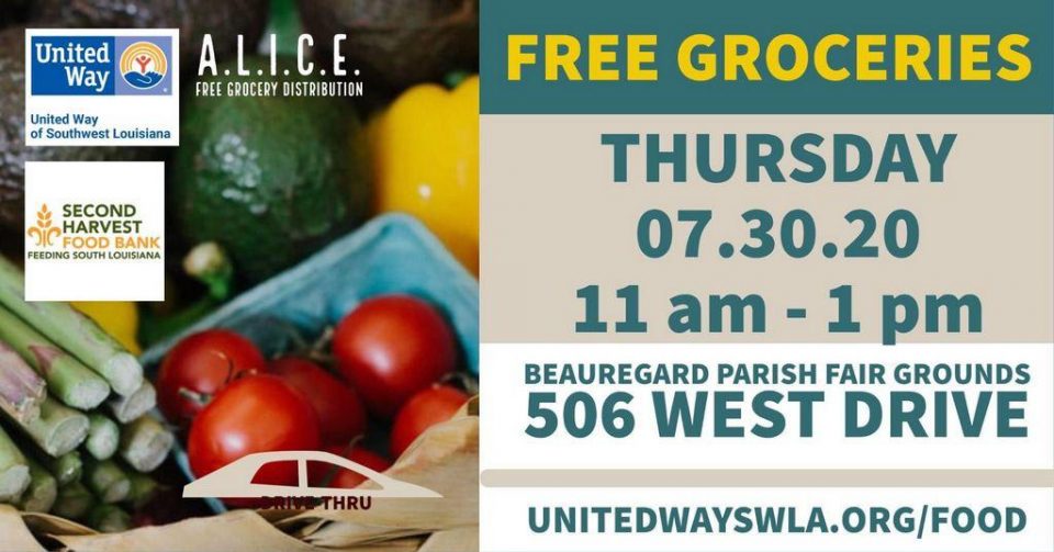 The United Way of Southwest Louisiana and Second Harvest Food Bank will hold a contact-free, drive-through grocery box distribution event in DeRidder from 11 a.m. to 1 p.m. Thursday, July 30 at the Beauregard Parish Fairgrounds at 506 West Drive.