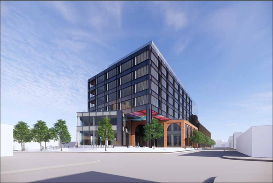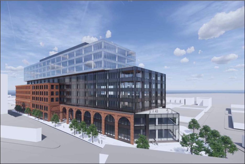 Updated rendering of the Acme Fish Expansion illustrates the Southeast corner of the development looking Northwest – Gensler Architect