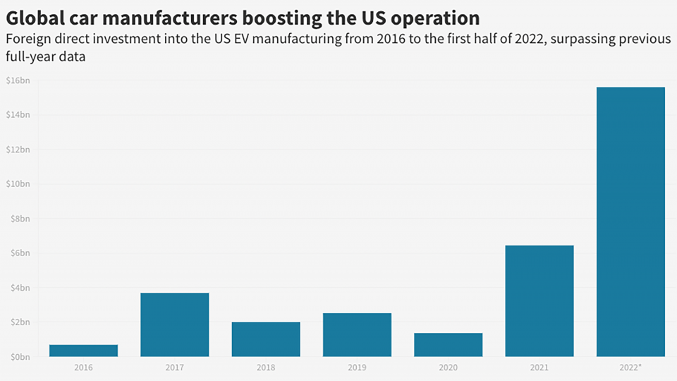With such demand on the horizon, an investment boom is already underway. During the first six months of 2022, the US experienced record high levels of foreign investment into its EV manufacturing market, totalling $15.6bn, according to fDi Markets data.