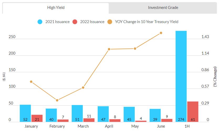 Investment-grade issuance fell 26% to $292 billion during 1H22. The decline was down only 14% through April compared with last year, but accelerated in May and June with issuance falling 60% and 44%, respectively, as rates continued to rise. Investment-grade issuance may be normalizing near 2019’s $617 billion after $1 trillion was issued in 2020.