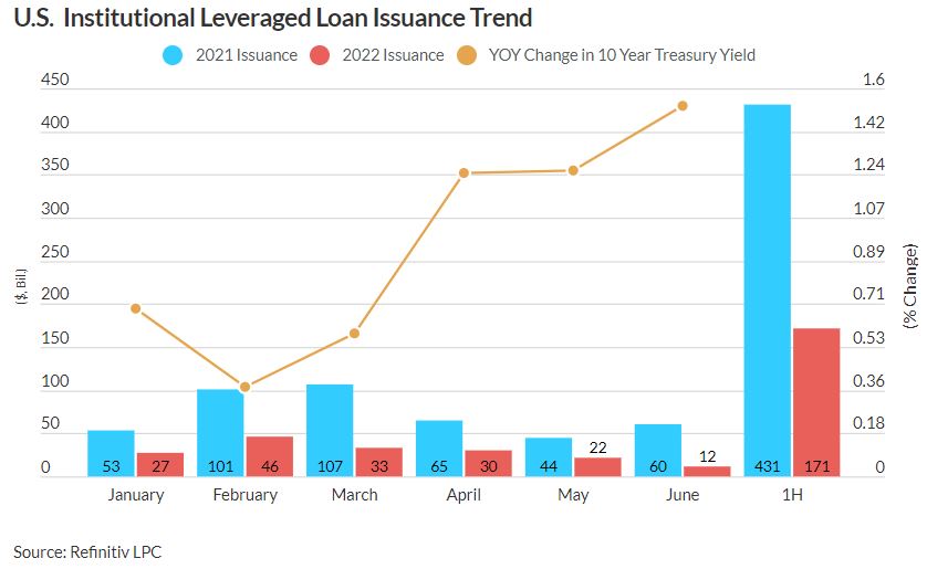 US institutional leveraged loan (LL) issuance is also down, falling 60% through 1H22 due to fewer refinancings and repricing transactions. LL issuance during June was the lowest since May 2020, at $12 billion, and was 79% below the comparable prior-year period.