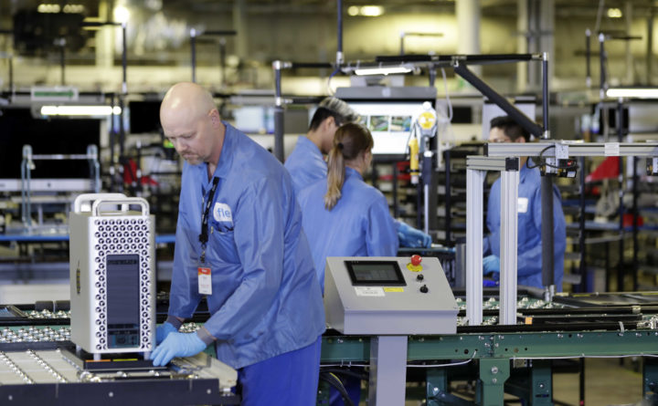 In this Nov. 20, 2019, file photo, workers are shown at an Apple manufacturing plant in Austin, Texas. American factories slowed for the third consecutive month in May as they continued to sustain economic damage from the coronavirus pandemic. The Institute for Supply Management, an association of purchasing managers, said Monday, June 1, 2020, that its manufacturing index came in at 43.1 last month after registering 41.5 in April. Anything below 50 signals that U.S. manufacturers are in retreat.