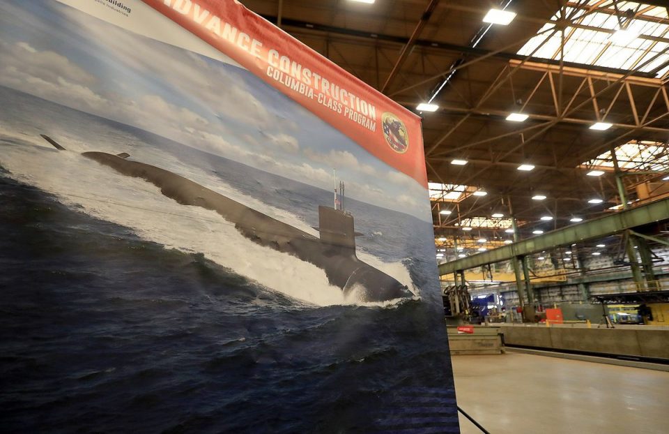 Participants at a groundbreaking in September 2019 for General Dynamics Electric Boat’s south yard assembly building in Groton examine a model of the Columbia class submarine. The building will be used to manufacture the next generation of submarines. (Brad Horrigan/Hartford Courant)