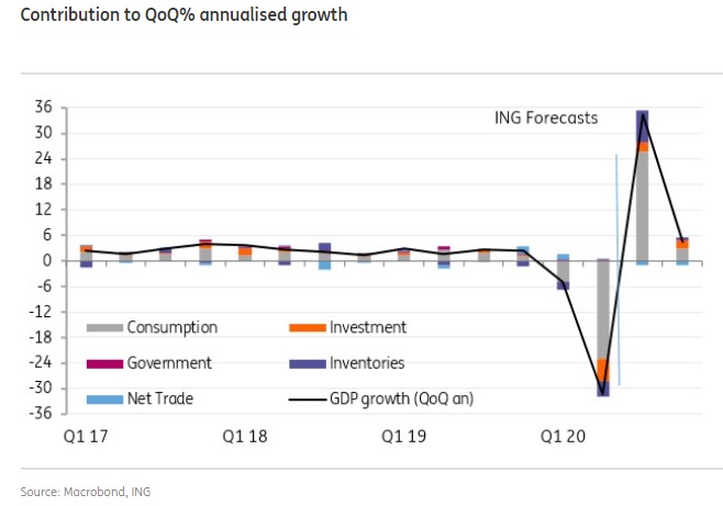 ING notes that the third-quarter US GDP data will be boosted by pent-up demand following and easing of lockdown restrictions. The very substantial Federal payments will, however, also be a key influence.