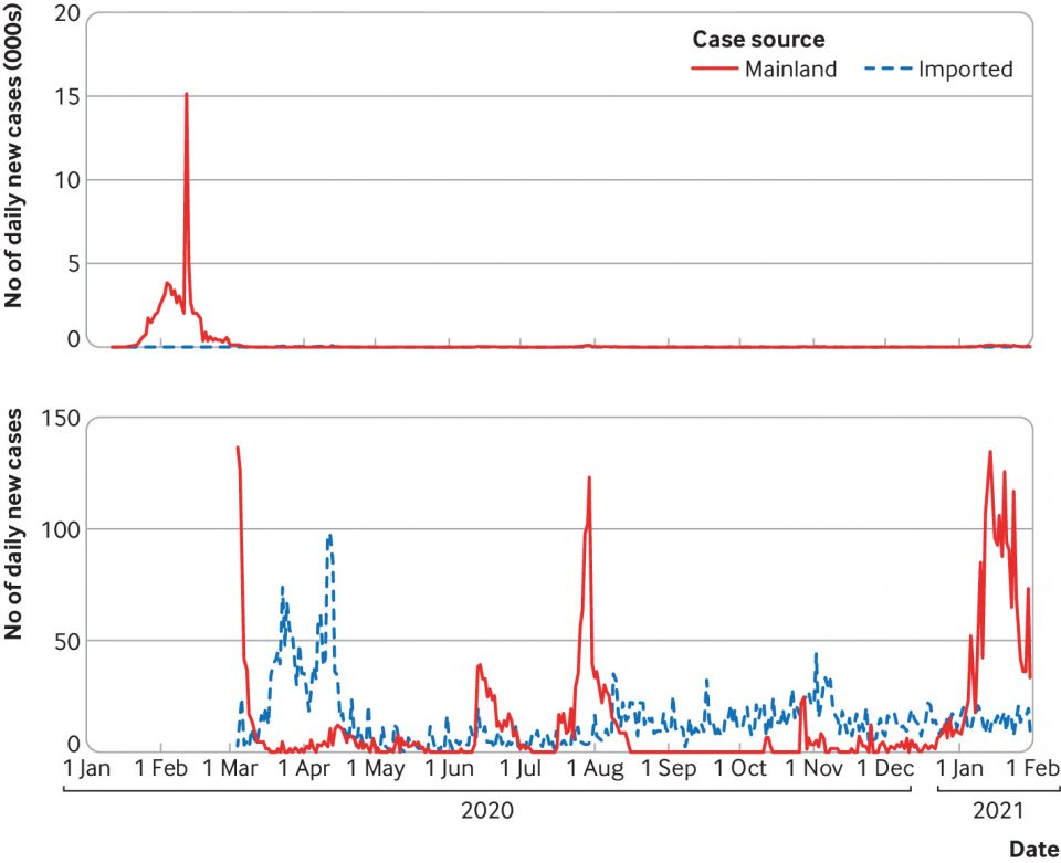 China brought the first outbreak of covid-19 under control in March 2020. The response to the virus then entered a new stage aiming at preventing importation and local resurgence of covid-19. Since March 2020, only sporadic daily new cases and some small scale outbreaks in China have been seen, whereas the epidemic is still spreading globally. A total of 83 249 cases were confirmed in the laboratory in mainland China when Wuhan was unblocked on 8 April 2020. Since that date, only 6315 further cases had occurred by 31 January 2021.1 The lessons learnt from the control of covid-19 in China are worth discussing.