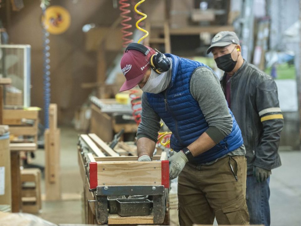 ![Vancouver, BC: NOVEMBER 18, 2020 -- Allright Ladders is a 99-year-old East Vancouver, BC business that is famous for making wooden ladders for industrial clients. The company is stopping production of their venerable Sitka spruce wooden ladders as market tastes and demands change. Pictured are workers at their factory on Franklin Street producing some of the last wooden ladders Wednesday, November 18, 2020.