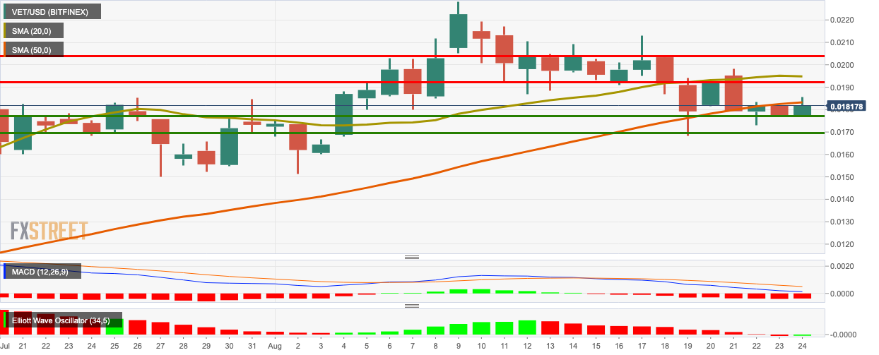 VET/USD bulls took charge in the early hours of Tuesday to cancel out a bearish Monday. In the process, the price has gone up from $0.01764 to $0.01817. The Elliott Oscillator has had a green session following 11 consecutive red sessions.