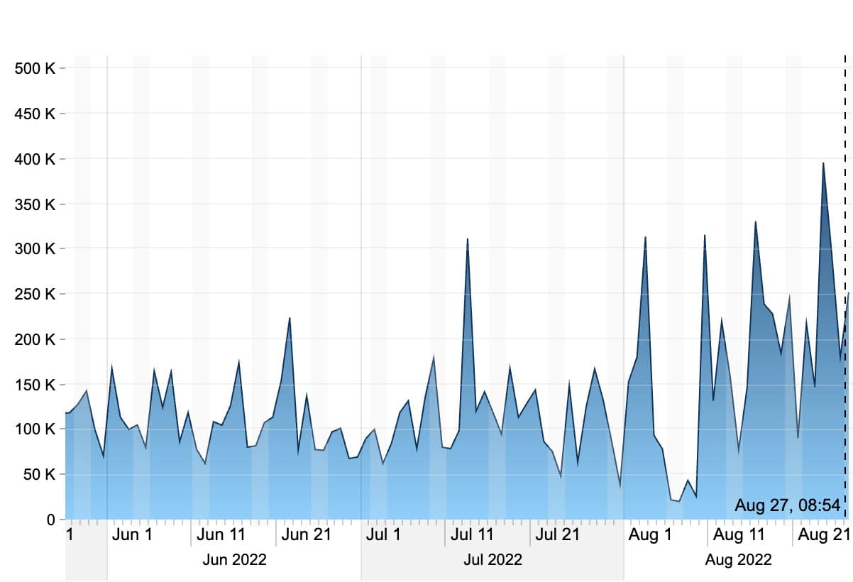 Although there has been a visible spike in activity since the beginning of August, one cannot ignore the difference compared to last year where the network was seeing over 2 million clauses a week. Unlike many other cryptocurrencies, VeChain’s price and its mainnet activity started declining since the beginning of 2022. The market wide sell-off following the collapse of Terra did impact VeChain’s mainnet activity, but as the chart indicates, it has pretty much recovered to pre-bear market levels.