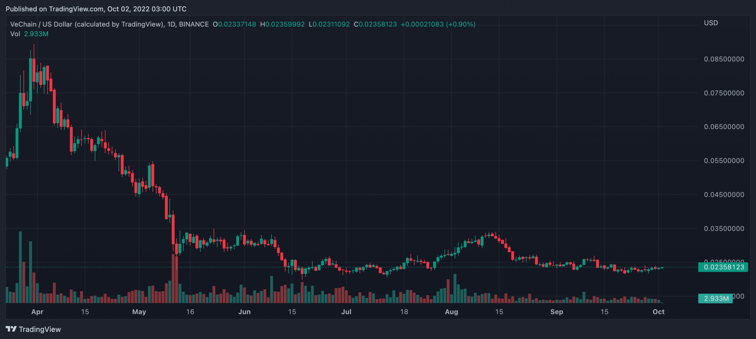 There was a brief rebound in VET’s price towards the end of the first quarter of 2022. The token surged all the way to $0.089 following the announcement of VeChain’s partnership with Draper University which entailed a fellowship and a Web3 accelerator program. However, May’s market-wide crash sent VET’s price tumbling down to $0.024. The price failed to recover from the bearish trend, despite news of a new partnership with Amazon Web Services and the Q1 financial report from the VeChain Foundation which showed a healthy balance sheet.