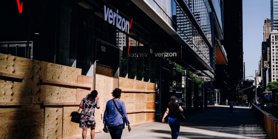 Pedestrians pass a boarded up Verizon store in Times Square New York, U.S., on Tuesday, June 9, 2020.