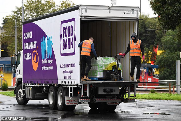 Truck drivers entering New South Wales and South Australia from Victoria are now required to take a COVID-19 every seven days. Pictured: Workers unloading supplies from a Food Bank truck in Melbourne